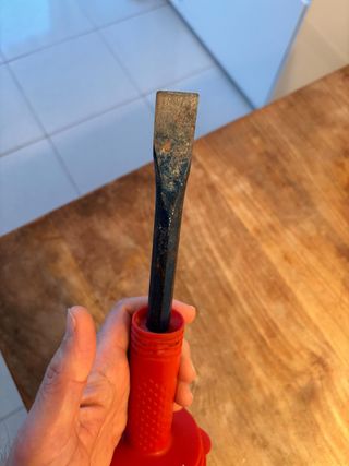 Cincel plano de la marca Bellota. Herramienta robusta para trabajos de albañilería o cantería. - Mango de plástico rojo con protección. - Varilla de acero azul. - Punta afilada para corte.