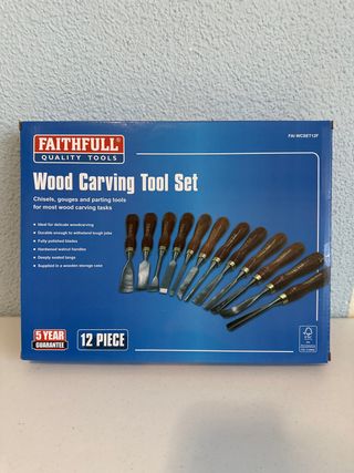 Set de 12 piezas de herramientas para tallado en madera de Faithfull. - Ideal para trabajos delicados de carpintería. - Cuchillas totalmente pulidas. - Mangos de nogal. - Se suministra en un estuche de madera.
