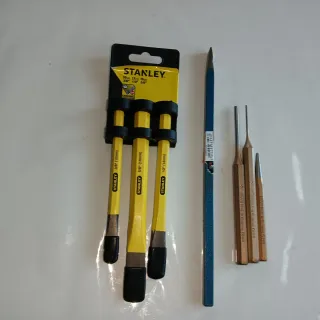 Conjunto de herramientas manuales Stanley. - Tres cinceles marca Stanley de diferentes tamaños: 3/8 (10mm), 5/8 (16mm) y 1/2 (12mm). - Un botador de punta. - Un botador de ranura. - Un botador cónico. - Un cincel marca bellota
