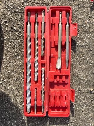 Set de brocas y cinceles para martillo percutor. - Incluye brocas de diferentes tamaños (22, 18, 16 son las mas grandes de la caja) - Incluye cinceles planos y de pala. - Estuche organizador rojo.