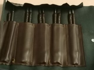 Conjunto de nueve jubias o cinceles para tallar madera. Incluye un estuche para guardarlos. - Nueve cinceles de diferentes tamaños.y formas - Mangos de madera con detalles en azul. - Incluye estuche de almacenamiento.no se a usado nunca envíos por Walapo ver más cosas en mi perfil