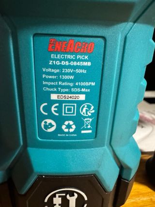 Martillo eléctrico de 1300W con diseño robusto y ergonómico. - Mango auxiliar para mayor control. - Cuerpo principal en color gris y detalles en turquesa. - Incluye cable de alimentación, dos cinceles y escobillas de repuesto