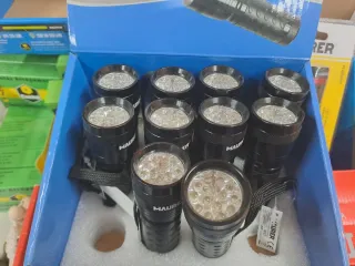 Pack de linternas LED de color negro. Son compactas y fáciles de transportar. - Cuerpo de aluminio. - Múltiples LEDs para una luz potente. - Incluye correa para colgar.