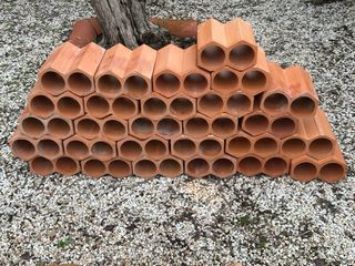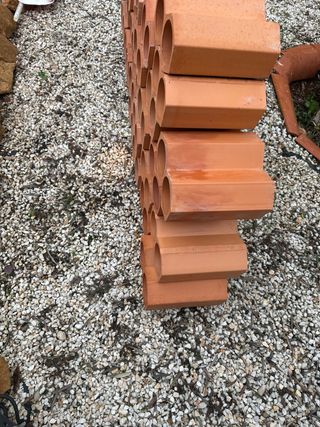 Lote de 27 ladrillos de terracota con forma hexagonal doble, ideales para crear botelleros o estructuras decorativas. - Material: Terracota. - Diseño: Hexagonal doble. - Cantidad: 30 unidades.