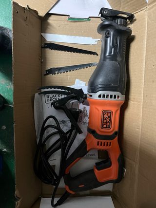 Sierra de sable Black+Decker en color naranja y negro. Incluye manual y hojas de sierra. - Mango ergonómico. - Diseño compacto. muy poco uso a cortado 2 veces madera