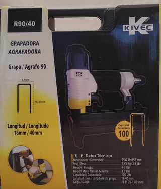 Grapadora neumática Kivec R90/40, a estrenar. - Modelo: R90/40 - Marca: Kivec Tools - Tipo de grapa: 90 - Longitud de grapa: 16-40 mm - Capacidad: 100 uds - Presión de trabajo: 4-7 Bar - Dimensiones: 55x235x255 mm - Peso: 1.45 Kg (3.1 Lb)