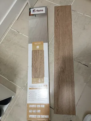 Suelo vinílico autoadhesivo de la marca Artens, modelo Sadema. - Medida de cada lama: 91,44 cm. - Cubre una superficie de 2,23 m². - Pack de 16 lamas. Tengo dos cajas, una de ellas está abierta pero están sin usar. Cada caja 20€