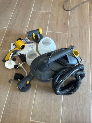 Sistema de pulverización de pintura Wagner W660. - Incluye pistola, depósitos y accesorios. - Manguera flexible. - solo se ha usado dos veces - hay piezas sin estrenar -la manguera tiene algunas manchas de pintura por fuera