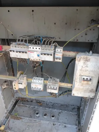 Cuadro eléctrico de obra con varios interruptores y protecciones. - Montado sobre carril DIN. - Caja metálica. - Ideal para instalaciones temporales o de obra.