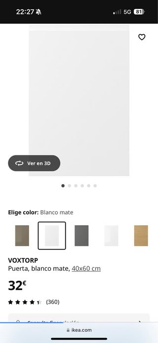 Puerta de armario VOXTORP blanco Una puerta por 20 euros. (Con el plástico, está nueva) - Medidas: 40x60 cm. - Color: Blanco mate. Una puerta por 10 euros (tiene pequeño golpe interno, no se ve por fuera y no afecta el funcionamiento) -Medidas: 40x80 cm. - color: Blanco brillo