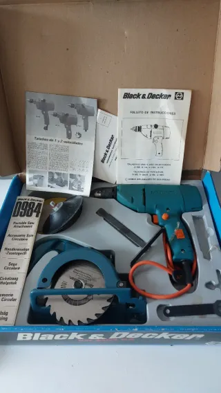 Kit de herramientas Black & Decker modelo D102. De la decada de los 70' 80'. Nuevo sin estrenar - Taladro percutor de 10 mm y 2 velocidades. - Sierra circular. - Incluye discos de lijado y pulido.