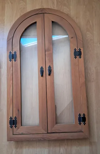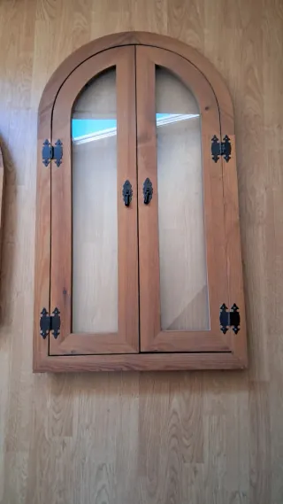 Se venden puertas de madera para mueble con un diseño arqueado y detalles rústicos. Medidas: 105x61,5 - Acabado en madera natural. - Bisagras y tiradores negros de estilo vintage. - Cristales transparentes.