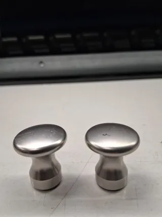Dos pomos de acero inoxidable con un diseño moderno y elegante. Perfectos para dar un toque de estilo a tus muebles. - Material: Acero inoxidable. - Acabado: Pulido. - Diseño: Curvo y ergonómico.