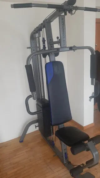 Se vende máquina de gimnasio multifunción en buen estado. Ideal para entrenar en casa. - Estructura metálica resistente. - Asiento y respaldo acolchados. - Torre de pesas incluida.