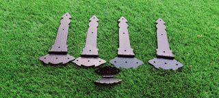 Juego de cinco bisagras decorativas de color negro. Son ideales para darle un toque elegante a tus puertas o muebles. - Fabricadas con un material resistente. - Diseño con textura punteada. - Añaden un toque rústico y sofisticado. - Perfectas para proyectos de bricolaje o restauración.