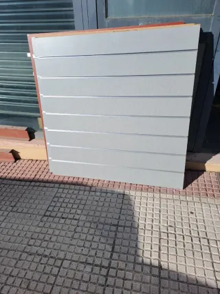 Panel de madera utilizado en exposiciones. - Color grisáceo. - Diseño con líneas horizontales.
