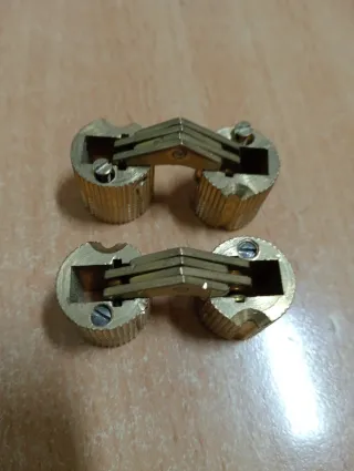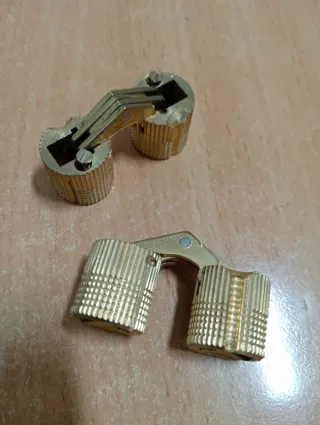 Conjunto de bisagras ocultas de latón con un acabado dorado. Son ideales para proyectos de carpintería. - Material: Latón - Color: Dorado - Diseño: Oculto