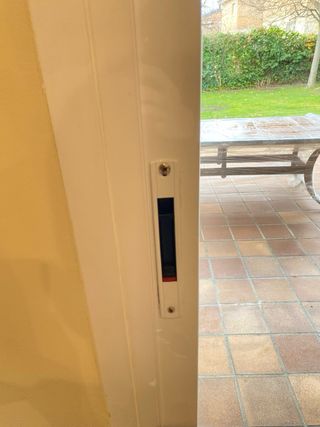 Puerta interior blanca de diseño minimalista. Está en perfecto estado. - Lacada en blanco. - Cuatro paneles horizontales. - Manilla metálica incluida. - Cerrojo - Marco de puerta incluido pero molduras no. - Madera maciza hecha por carpintero