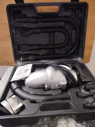 Set de aerografía completo, ideal para iniciarse en el modelismo o la pintura artística - Compresor de aerógrafo plateado. - Manguera de conexión azul - Aerógrafo . - Caja de accesorios con recipientes. - Usado solo una vez *Regalo plantillas, propelente, limpiador