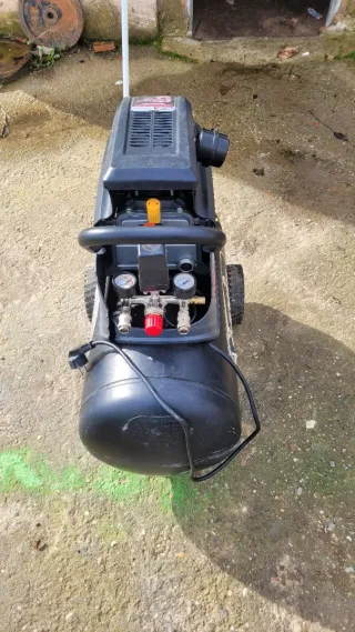 Compresor de aire portátil con depósito funcionando sin problema. - Color negro. - Ruedas para facilitar el transporte. - Manillar. - Manómetros para control de presión.