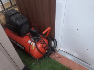 Compresor de aire con depósito rojo y motor negro. - Asa de transporte roja. - Ruedas para facilitar el movimiento. - Manguera negra enrollada. Aceite cambiado y revisado, funciona perfectamente