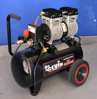 Compresor de aire silencioso de la marca Cevik Pro, modelo Silenc 24. - Depósito de 24 litros. - Diseño compacto y portátil con ruedas. - Asa para facilitar el transporte. - Doble cabezal de compresión.