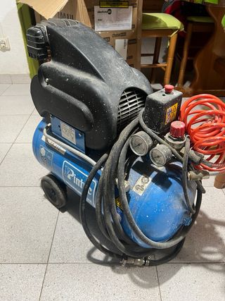 Compresor de aire compacto con depósito de 6 litros. Ideal para diversas tareas. - Depósito de 6L. - Asa para transporte. - Manómetro incluido. -Al parar pierde un poco de aire pero funciona perfectamente