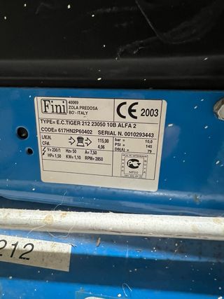 Vendo compresor de aire FINI (fabricación italiana) modelo Tiger 212 / MK 212M funcionando perfectamente. Se vende por cierre de tienda por jubilación. ⚙️ Características: • Depósito: 50 litros • Presión máxima: 10 bar / 145 psi • Potencia: 1,5 CV (1,1 kW) • Caudal: 183 l/min (6,5 CFM) • Alimentación: 230 V • Motor 2850 rpm • Regulador con doble manómetro 🧰 Incluye: • Compresor con ruedas • Regulador de presión • Manguera • Pistola de inflado con manómetro