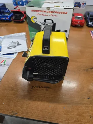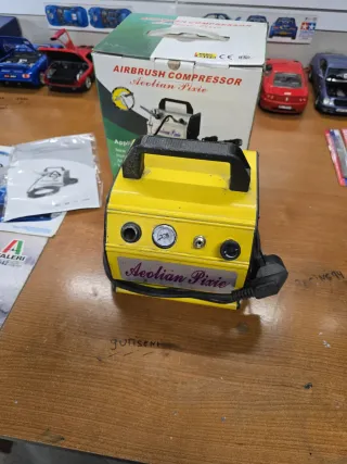 Compresor de aerografía Aeolian Pixie en color amarillo. Ideal para trabajos de modelismo y manualidades. Lo vendo para piezas funcionar funciona pero pierde presion a la hora de pintar Por favor mirar bien las fotos no incluye aerografo ni manguera