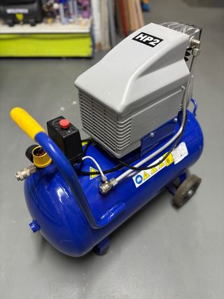 Compresor de aire MPC con depósito de 25 litros y 2 HP, con accesorios. Comprado para un trabajo en casa puntual y guardado. Prácticamente nuevo. Incluyo algunos complementos para inflado de ruedas coche/moto o balones y soplado para limpieza. - Incluye manómetro. - Incluye manguera enrollada de color naranja. - Incluye pistola de aire y boquilla. - Incluye adaptadores. Únicamente entrega en mano.