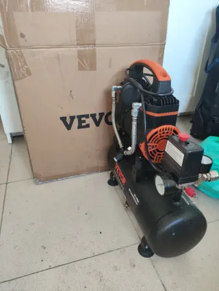 Compresor de aire VEVOR, modelo de tecnología Oil-free. - Capacidad del tanque: 6.3 Galones / 24 L - Potencia: 2 HP / 1450 W - Caudal: 3.35 CFM @ 90 PSI - Presión de trabajo: 87-116 PSI / 6-8 Bar - Nivel de ruido: 70 dB - Peso: 47.4 lbs / 21.5 kg