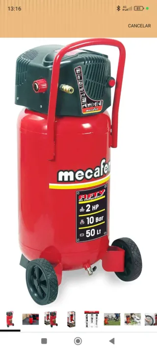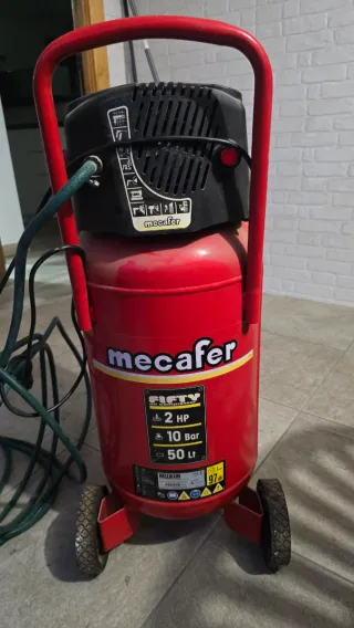Compresor de aire Mecalfer de 50 litros, ideal para diversas tareas. - Capacidad del depósito: 50 Litros. - Potencia: 2 HP. - Presión máxima: 10 Bar. - Color: Rojo.