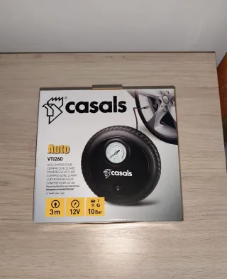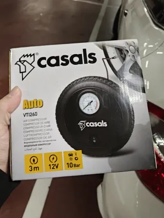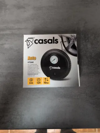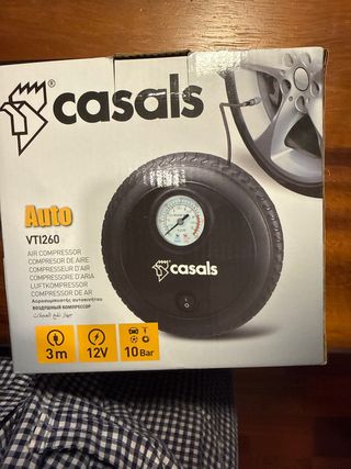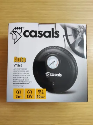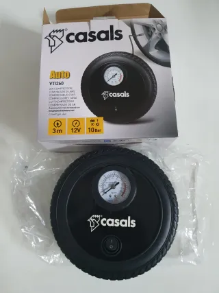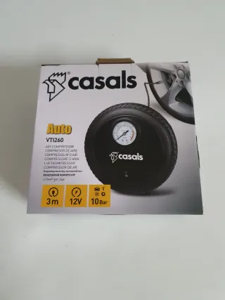 Compresor de aire portátil de la marca Casals, modelo VT1260. - Alimentación: 12V. - Presión máxima: 10 Bar. - Longitud del cable: 3 metros. - Incluye manómetro para control de presión. Nuevo, sin uso (únicamente abierto para las fotos) Se realizan envíos