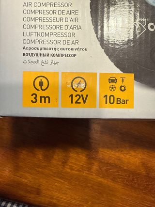 Compresor de aire Casals modelo VT1260. - Voltaje: 12V. - Presión máxima: 10 Bar. - Longitud del cable: 3 metros.