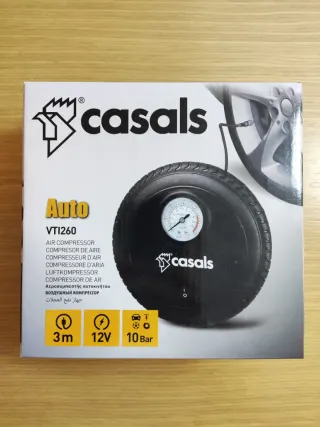 Compresor de aire de la marca Casals, modelo VT1260. - Voltaje: 12V. - Presión máxima: 10 bar. - Longitud del cable: 3 metros.