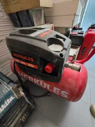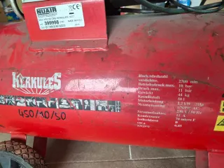 Compresor de aire de la marca Herkules, modelo 450/10/50. - Capacidad del calderín: 50 l. - Presión máxima: 10 bar. - Potencia: 2.2 kW / 3HP. - Voltaje: 230 V / 50 Hz.