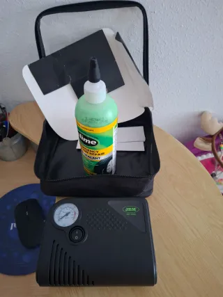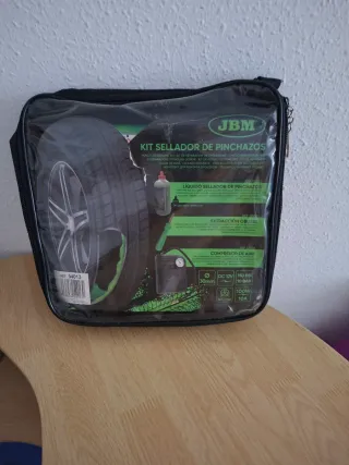 Kit sellador de pinchazos JBM que incluye un compresor de aire. - Líquido sellador de pinchazos. - Extracción de obuses. - Compresor de aire DC 12V, 150 PSI, 10 BAR, 100W, 10A. - Incluye funda de transporte.