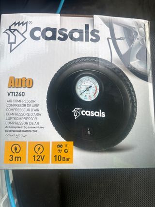Compresor de aire portátil Casals VTI260. - Modelo: VTI260 - Voltaje: 12V - Presión máxima: 10 Bar - Longitud del cable: 3 metros Precio negociable. Venta, preferiblemente, en mano.