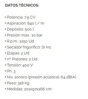 Compresor de pistón con cabezal de hierro, transmisión por correa. Funcionamiento automático mediante presostato y equipado con guardamotor de rearme manual. Ventilación a través de volante sobredimensionado. Datos técnicos: Potencia: 5,5 CV Aspiración: 640 ltrs x min (a 8 bares 750) Depósito: 500 l Conexión: 1/2 " Presión max.: 10 bar R.p.m.: 1340 Ud Etapas: 2 Ud no Pistones: 2 Ud Tensión: 400 V Peso: 222 Kg Medidas: 201x65x133 cm Somos empresa instaladora estatal. Alta en industria gratis. Precio sin Iva. Envío GRATIS. Kit de pistolas de aire comprimido GRATIS por la compra de tu compresor.