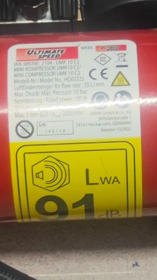 Mini compresor de aire de la marca Ultimate Speed. - Modelo: UMK 10 C2 - Caudal de aire: 35 L/min - Presión máxima: 10 bar - Potencia nominal: 180 W - Nivel de potencia acústica LwA: 91 dB
