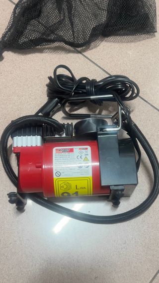 Vendo mini-compresor Norauto ref. 882154. • Alimentación 12 V (enchufe mechero). • Manómetro analógico protegido por goma, rango 0-10 bar. • Caudal 35 L/min: infla un neumático estándar en ±3 min. • Linterna LED incorporada y asa ergonómica. • Incluye bolsa de transporte, 3 boquillas, fusible de repuesto y manual. Apenas se ha usado un par de veces; lo vendo porque he cambiado a un compresor mayor.