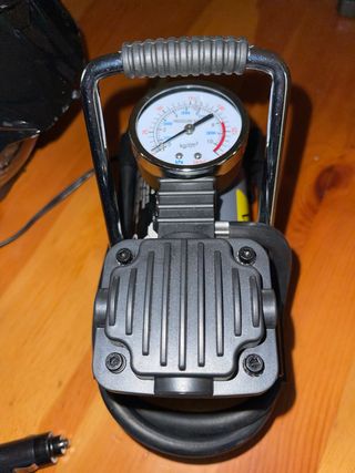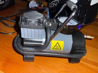 Hinchador de aire 12V. Solamente usado una vez para comprobar que funciona. Se puede hinchar hasta una presión máxima de 10 Bar o 260 psi. Cable de 3m y manguera de aire. 3 boquillas distintas para inflar ruedas y balones.