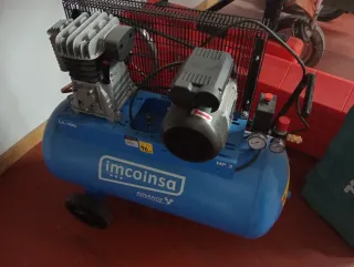 Compresor de aire de la marca Imcoinsa con un depósito de 100 litros y 3 caballos de potencia. - Modelo advance 04N423 - Presión máxima de 96 PSI. - Dos manómetros para control de presión. - Ruedas para facilitar el transporte.