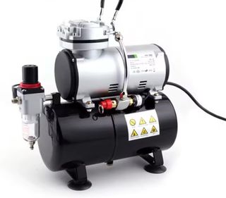 Compresor de aire para aerografía Diseñado para un uso eficiente y estable. Compresor de aire de pistón sin aceite de poco ruido, bomba portátil de 3l, 550w, silencioso, compresor de aire sin aceite de 3 litros para pintar - Depósito de aire negro. - Cuerpo plateado del motor. - Incluye regulador de presión y filtro. Incluye soporte para Airógrafos