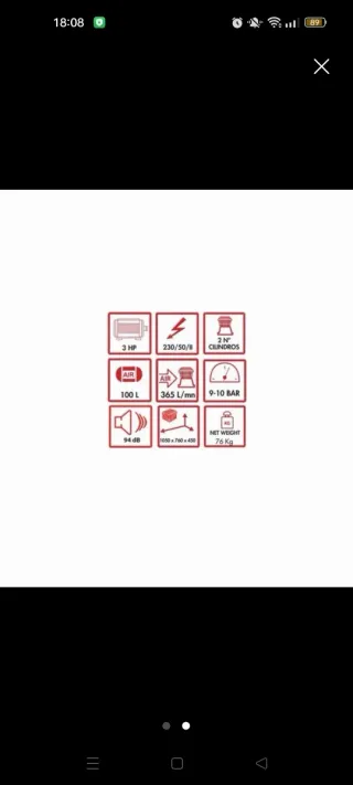 Compresor de aire de 100 litros con motor trifásico. 10kg de carga - Capacidad del depósito: 100 litros. - Tipo de motor: Trifásico. También se escucha algún tipo de cambio