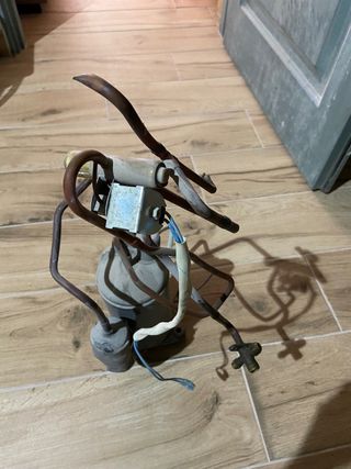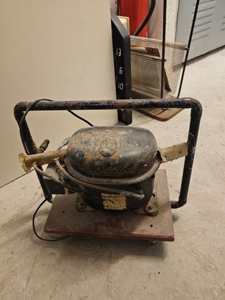 Compresor de aire acondicionado antiguo, en buen estado para su edad. - Se ve robusto y resistente. - Presenta algo de óxido superficial.