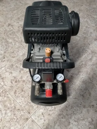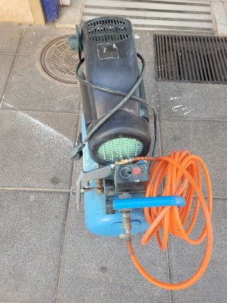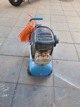 Compresor de aire en buen estado y a buen precio. Ideal para diversas tareas. - Tanque de aire de color azul. - Manguera naranja enrollada. - Asa de transporte azul.
