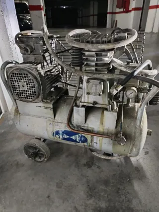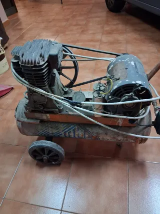 Compresor de aire de antiguo, para reparar, si hay toma de tierra la luz salta y si no funciona normal, pero se calienta mucho. Se recoge en Piera ( Can claramunt) - Motor eléctrico. - Manómetro visible. - Ruedas para facilitar el transporte. NO NEGOCIABLE