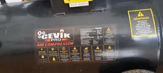 Compresor de aire Cevik Pro con motor de 3 HP y depósito de 25 litros, está un poco sucio (con polvo por encima) - Modelo: 25vx - Potencia: 3 HP - Capacidad del depósito: 25 litros - Ruedas para fácil transporte - Manómetros para control de presión - Incluyo tubo largo de enganche rápido.