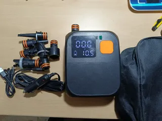 Compresor de aire portátil con batería recargable y luz integrada. Ideal para inflar colchonetas y otros objetos. Sirve como batería portátil powerbank. Nuevo sin uso solo algún rayado como se ven en las fotos de ahí su precio. - Incluye varios adaptadores. - Bolsa de transporte. - Pantalla digital.
